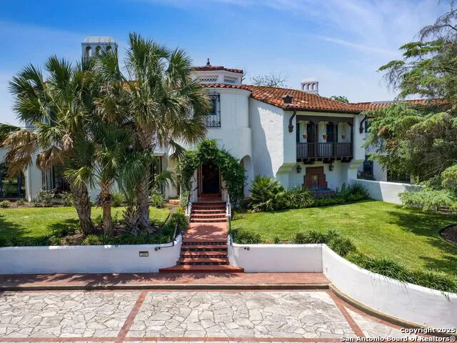 Originally built in 1939 for the developer of Terrell Hills, this magnificent Atlee B. Ayres-designed Spanish Revival estate is a rare opportunity to own a true piece of San Antonio history. Set on nearly an acre (.9 acres) of open, spacious grounds and gated courtyards, this 6,242 sq ft residence is a striking blend of architectural pedigree, timeless elegance, and generous space. This legacy property is perched on a hilltop in one of the city's most desirable neighborhoods. Wrap-around interior porches with stunning wood designs grace the informal living areas, along with the formal living room, designed for both grand entertaining and comfortable daily living. The dramatic entryway makes a lasting first impression with high, intricate ceilings, beautiful crown moldings, and a stunning solid wood staircase that speaks to the home's historical craftsmanship. Details such as a domed plaster ceiling, original concrete tile flooring, and Malou Flato hand-painted tiles are a few of the intricate, unique features of the property. The many arched doorways and windows provide abundant natural light. The silver leaf painted enclaves showcase invaluable treasures. The home has 3 bedrooms and 5.5 bathrooms with the primary bedroom upstairs. The garage features a walk-in refrigerator and freezer-a rare luxury. The three-car garage offers ample room for vehicles and storage. This is not just a home, it's an architectural statement and a rare opportunity to own an extraordinary, iconic property.